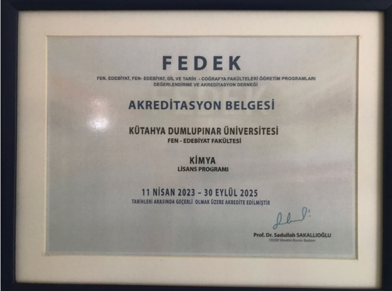 The Chemistry Undergraduate Program of the Faculty of Arts and Science at Kütahya Dumlupınar University has been accredited by FEDEK (Association for Evaluation and Accreditation of Teaching Programs of Faculties of Science, Arts, Arts and Science, Language, History and Geography) between April 11, 2023, and September 30, 2025.