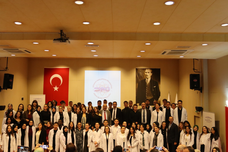 This year, the first “Laboratory Coat Ceremony” was held in our Chemistry Department. The ceremony, held on Wednesday, October 22nd at 2 PM in the Germiyanoğlu Yakup Bey Conference Hall of Dumlupınar University Faculty of Arts and Science, saw our students receive their laboratory coats, symbolizing their first step into their professional lives, from our department professors and representatives of the Chemists’ Association.