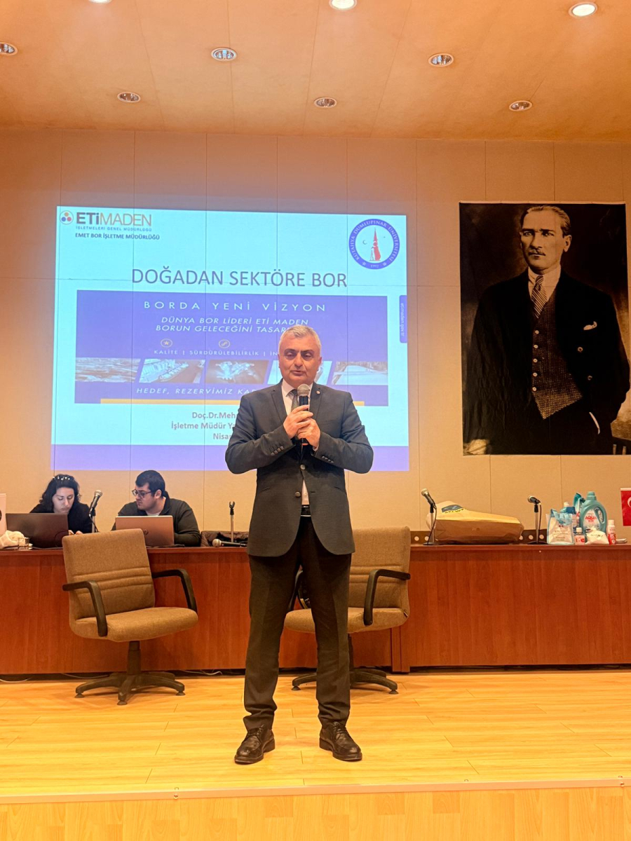 Etkinliğin bir diğer konuşmacısı Doç. Dr. Mehmet Savaş ise “Doğadan Sektöre Bor” başlıklı sunumunda bor elementinin özelliklerini, Türkiye’nin bor rezervleri açısından dünyadaki konumunu ve borun endüstriyel kullanım alanlarını aktardı. Türkiye’nin dünya bor rezervlerinin önemli bir kısmına sahip olduğunu belirten Savaş, özellikle Kütahya Emet bölgesinin stratejik önemine değindi. Sunumda ayrıca borun çıkarılmasından işlenmesine kadar olan üretim süreçleri ve farklı sanayi alanlarındaki kullanım potansiyeli katılımcılarla paylaşıldı.